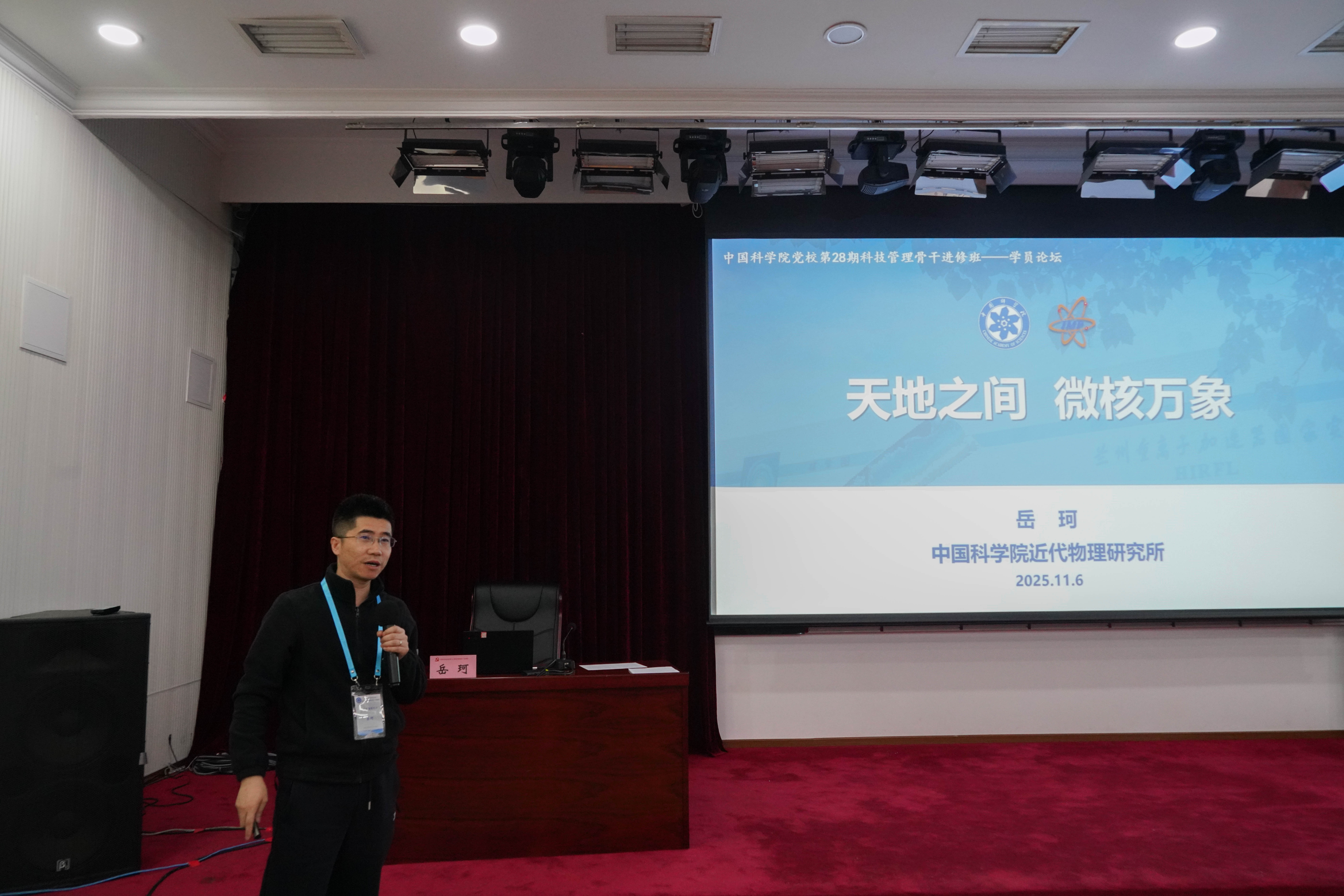 2025年11月6日上午,中国科学院党校第28期科技管理骨干进修班第三期学员论坛在雁栖湖校区多功能厅举办。党的十八大以来,党中央确立 2035 年建成科技强国的奋斗目标。习近平总书记在 2024 年全国科技大会等会议上强调,要锚定这一目标,加强顶层设计和统筹谋划,加快实现高水平科技自立自强。本次学员论坛围绕“建立大科学装置,助力科技强国”这一主题,由六位来自不同研究所的学员围绕建设大科学装置、攻坚重大科技任务和抢占科技制高点三个方面,分享了各自单位概况、研究领域发展态势和研究团队创新成果。本次论坛由新疆生态与地理研究所周晓兵学员主持。