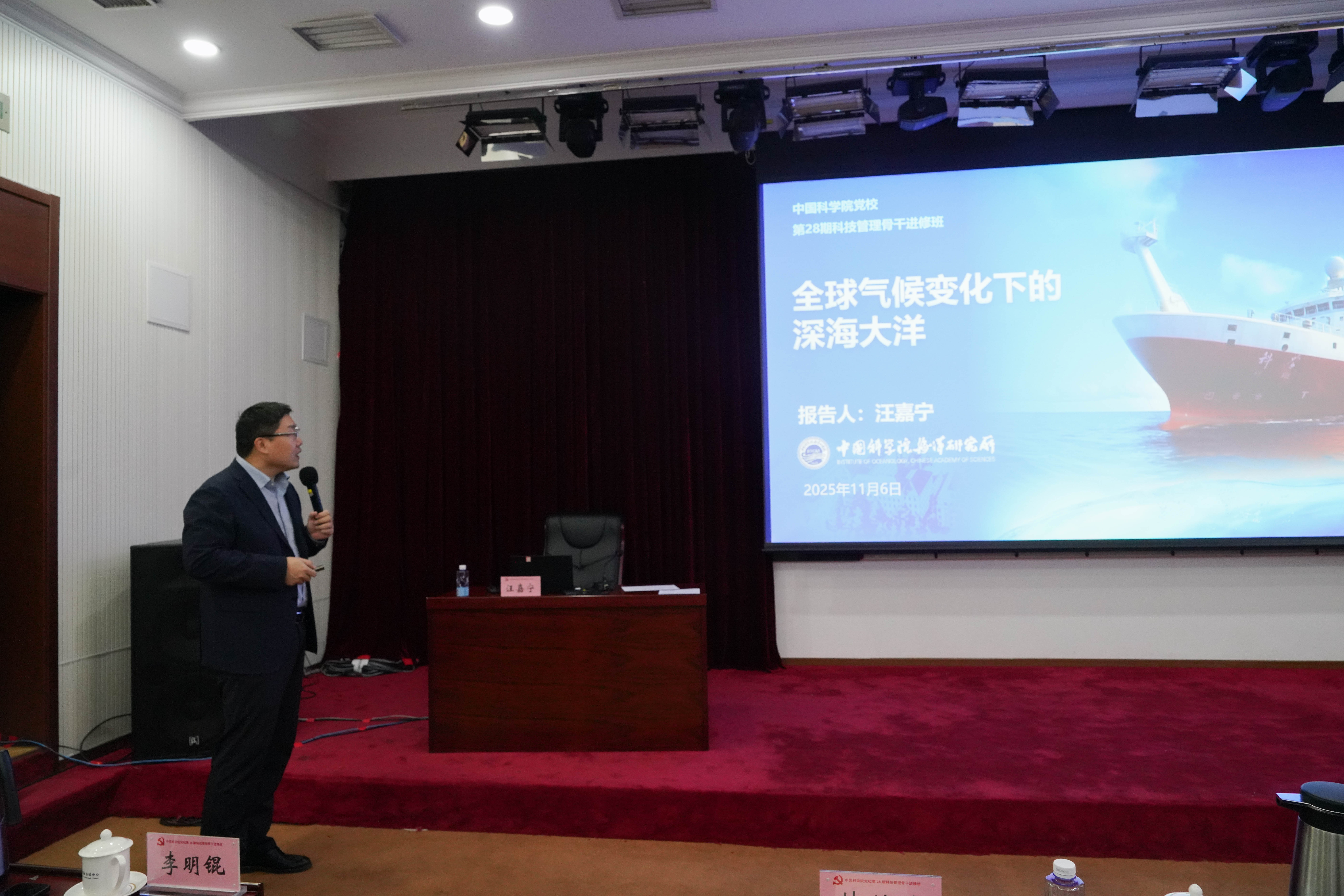 海洋研究所汪嘉宁学员以《全球气候变化下的深海大洋》为题,介绍了西太平洋对我国气候变化、动力灾害和海洋环境安全保障的显著影响;海洋所面向上述国家重大战略需求,构建了西太平洋科学观测网,包括重复性断面调查和浮标、潜标、深海着陆器组成的定点长期观测,并通过水下和卫星通信,实现了深海数据的实时传输。最后介绍了海洋科学正加速迈入大科学时代,基础、工程和高技术学科在海洋中均有涉及,期待各界英才投身海洋科研事业,在海洋中开展多学科交叉和联合协同研究,共同建设海洋强国。