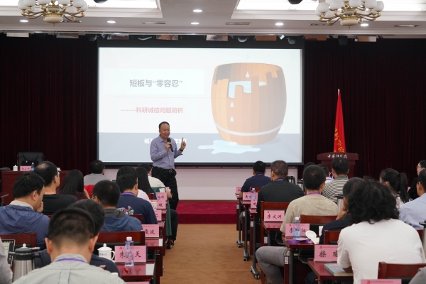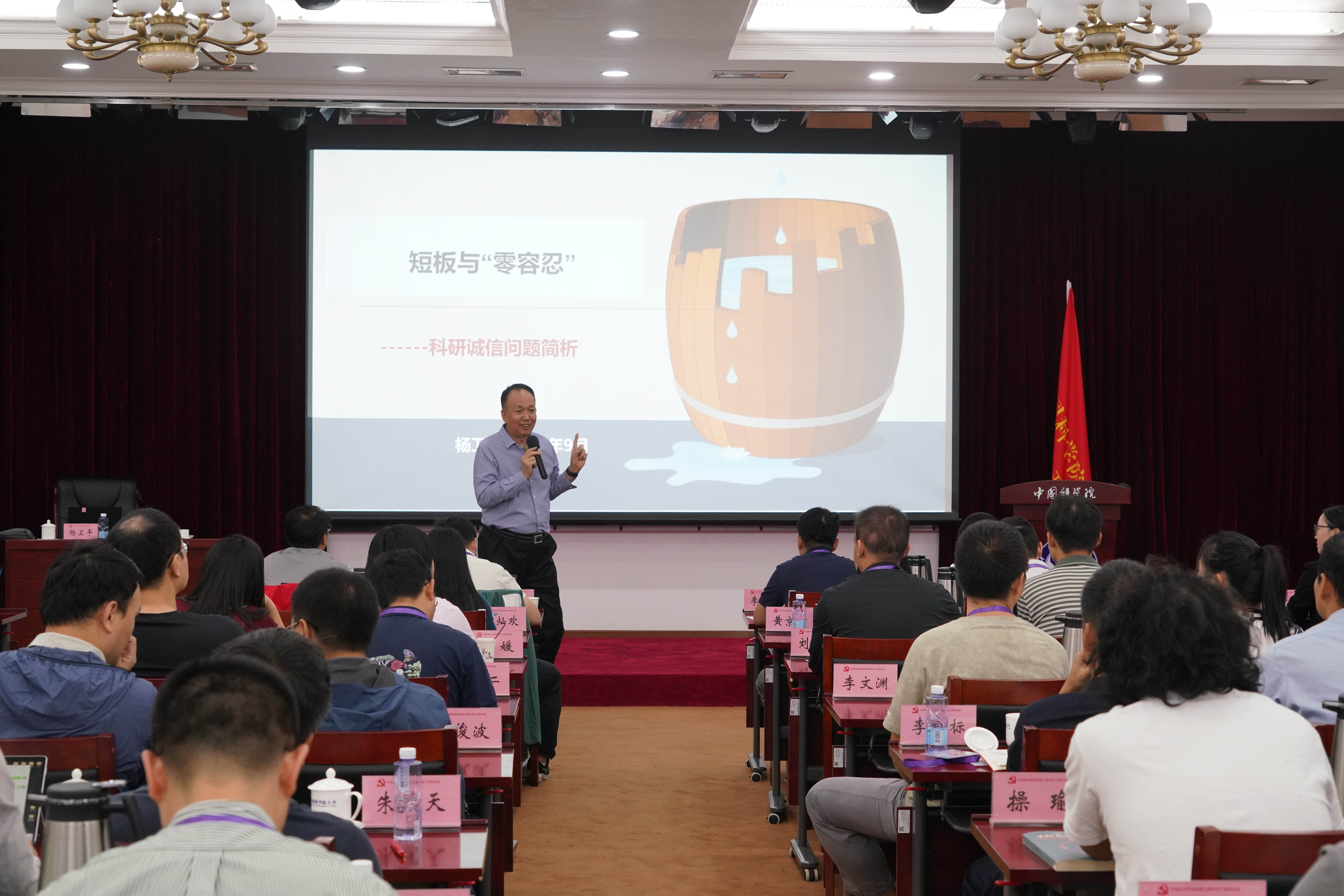 2025年9月28日上午,第九期年轻干部特训班聚焦科研生态建设核心议题,开展“短板与零容忍”科研诚信问题简析课程。本次课程由中国科学院原监督与审计局原局长杨卫平主讲,以问题为导向、以案例为支撑,深入剖析科研诚信建设的痛点难点,为全体学员明晰学术道德边界,夯实高水平科技创新人才队伍建设的道德根基。